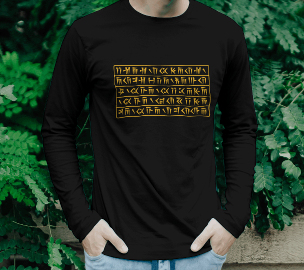 بر روی این تیشرت آستین بلند نیایش داریوش بزرگ به خط میخی نقش بسته است.