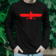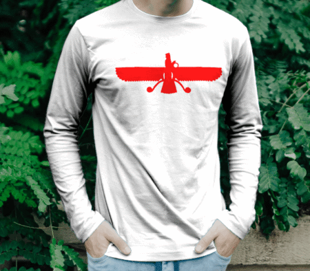 بر روی این تیشرت آستین بلند نگاره فروهر یا فر کیانی به رنگ سرخ نقش بسته است.