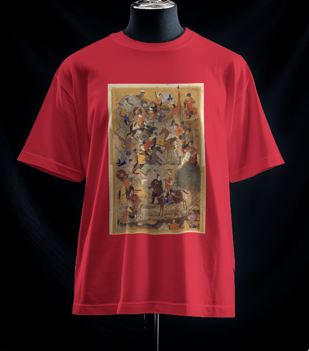 تیشرت حماسه (رنگ سرخ) صددرصد نخ و از الیاف طبیعی تهیه و تولید شده است و از تولیدات گیومرث استایل است. این تیشرت تولید ایران است و در تولید آن از بهترین پارچه استفاده شده است. دوخت این تیشرت نیز بسیار با کیفیت و ماندگار است. بر روی این تیشرت نگاره ای نفیس از شاهنامه نقش بسته است.