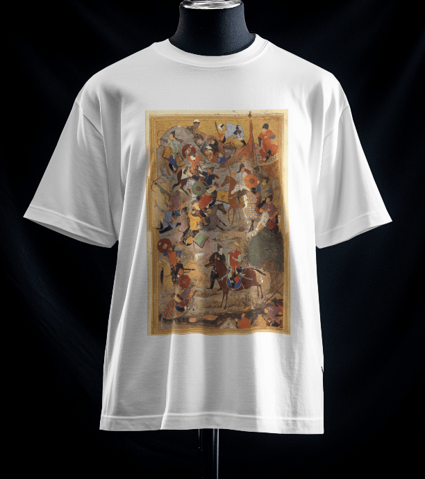 تیشرت حماسه (رنگ سفید)صددرصد نخ و از الیاف طبیعی تهیه و تولید شده است و از تولیدات گیومرث استایل است. این تیشرت تولید ایران است و در تولید آن از بهترین پارچه استفاده شده است. دوخت این تیشرت نیز بسیار با کیفیت و ماندگار است. بر روی این تیشرت نگاره ای نفیس از شاهنامه نقش بسته است.