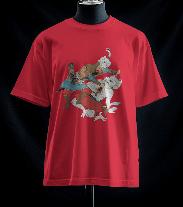 تیشرت خوان هفتم نبرد رستم با دیو سپید را به تصویر کشیده است.