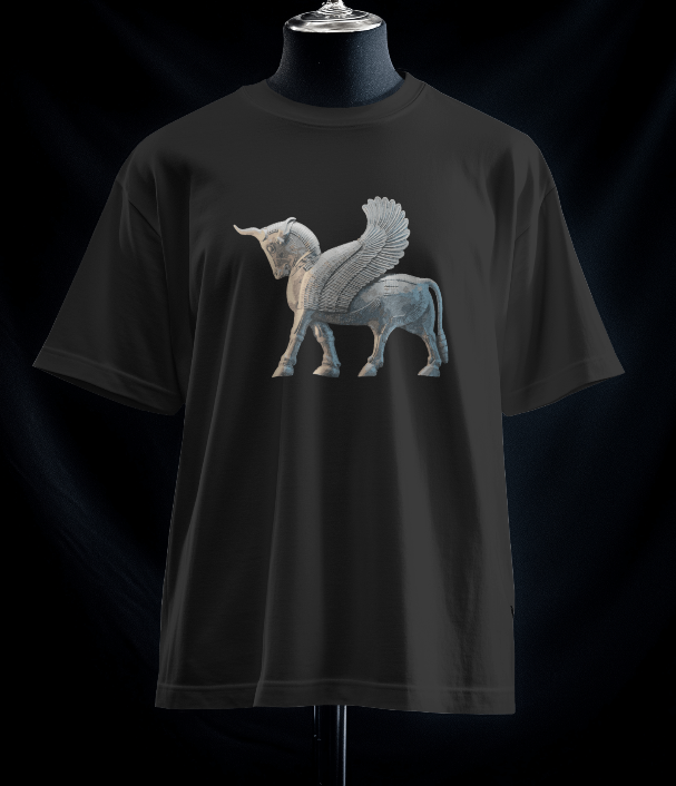 بر روی این تیشرت آستین کوتاه گاو بالدار نقش بسته است.